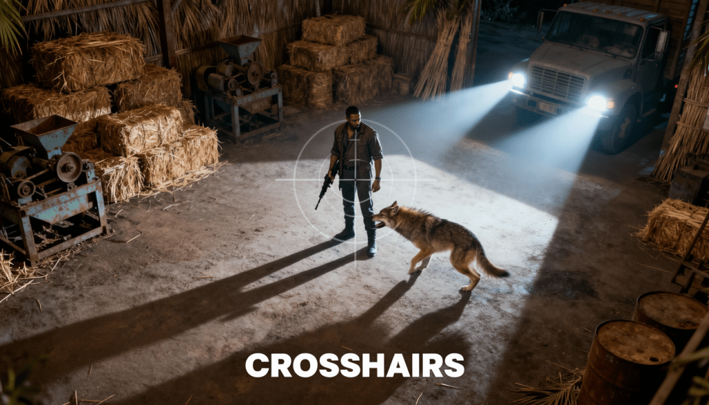 They slipped through the depot, weaving between raffia stacks and rusted machines until the yard opened ahead. Bravo team, three strong, fanned into a spearhead toward the rear gate. One climbed the bale stack. One slid along the wall. The third advanced centre in a low, tactical crouch.